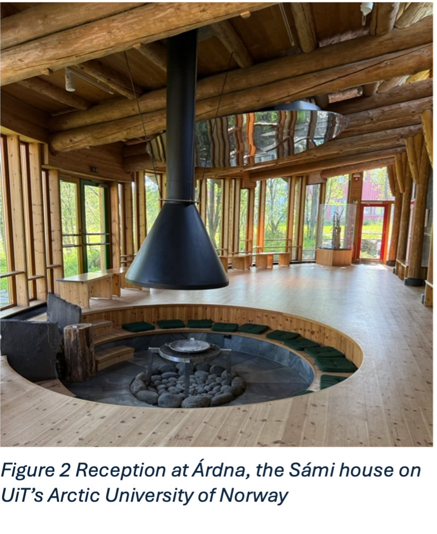 We arrived in Tromsø/Romsa in a period of 24‑hour daylight (Figure 1) and were welcomed at Árdna, the Sámi house on UiT’s Arctic University of Norway campus (Figure 2). The Árdna is a Sámi cultural center with symbolic value, constructed using materials from Sámi-populated areas and crafted by Sámi artisans. In the Árdna, we introduced ourselves and the projects or independent research we represent, while expressing the hardships that Indigenous people face in their relationship with the earth, river, and salmon, and what we can do to make a change for the future - paving the way for the River Dialogues Across Sápmi. In Tromsø, we met with others who joined us in the River Dialogues Across Sápmi workshop. Those of us on the Sharing Our Knowledge team include Camilla Brattland, who also served as the trip coordinator, Heather Smith, and Andrea Momblanch from Cranfield University. From Dalhousie University, Alitta Sylliboy Patles, a Mi’kmaq woman who also works at the Unama’ki Institute of Natural Resources and a graduate student, Madison Gouthro, a PhD student, and Emalie Hayes, a postdoctoral researcher, joined the trip. Another group that joined us was the “Surviving the Unthinkable” (SUN) research group, led by Gunlog Für, Janne Lahti, and Lindsay Doran. Zena Cumpston of the Barkandji Nation and Maddison Miller of the Dharug Nation joined the trip as independent researchers from Australia. Later, we met with Katri Somby, a Sámi historian and a local Indigenous person from the Deatnu River.