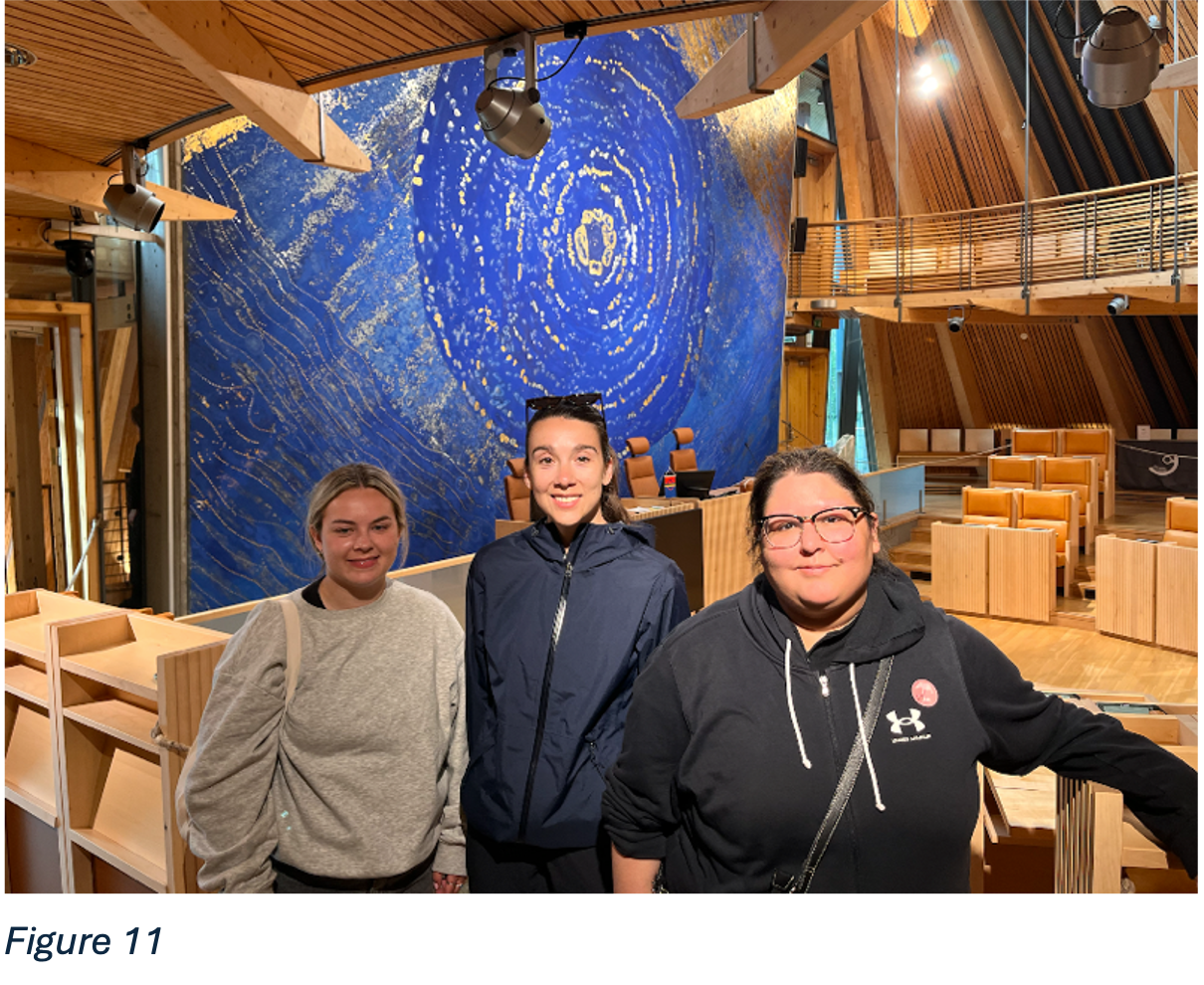 In Kárášjohka/Karasjok, we were given a personal tour of the Sámi Parliament of Norway by Sámi historian Katri Somby, who guided us through the building’s architecture and legislative chambers. Her insights on how Indigenous representation influences governance enriched our perspective on legal frameworks for river rights in the north. Stepping into Vandrehallen, the Parliament’s larch‑clad foyer, we were greeted by large windows framing the surrounding forests and grand wooden corridors. Walking by the library, which is home to 30,000 volumes across nine Sámi languages, plus specialist works in English, and Latin. As you enter the plenary assembly hall, at the very heart of the Sámi Parliament, your attention is drawn to the large artwork by Hilde Schanke Pedersen (Figure 11).
