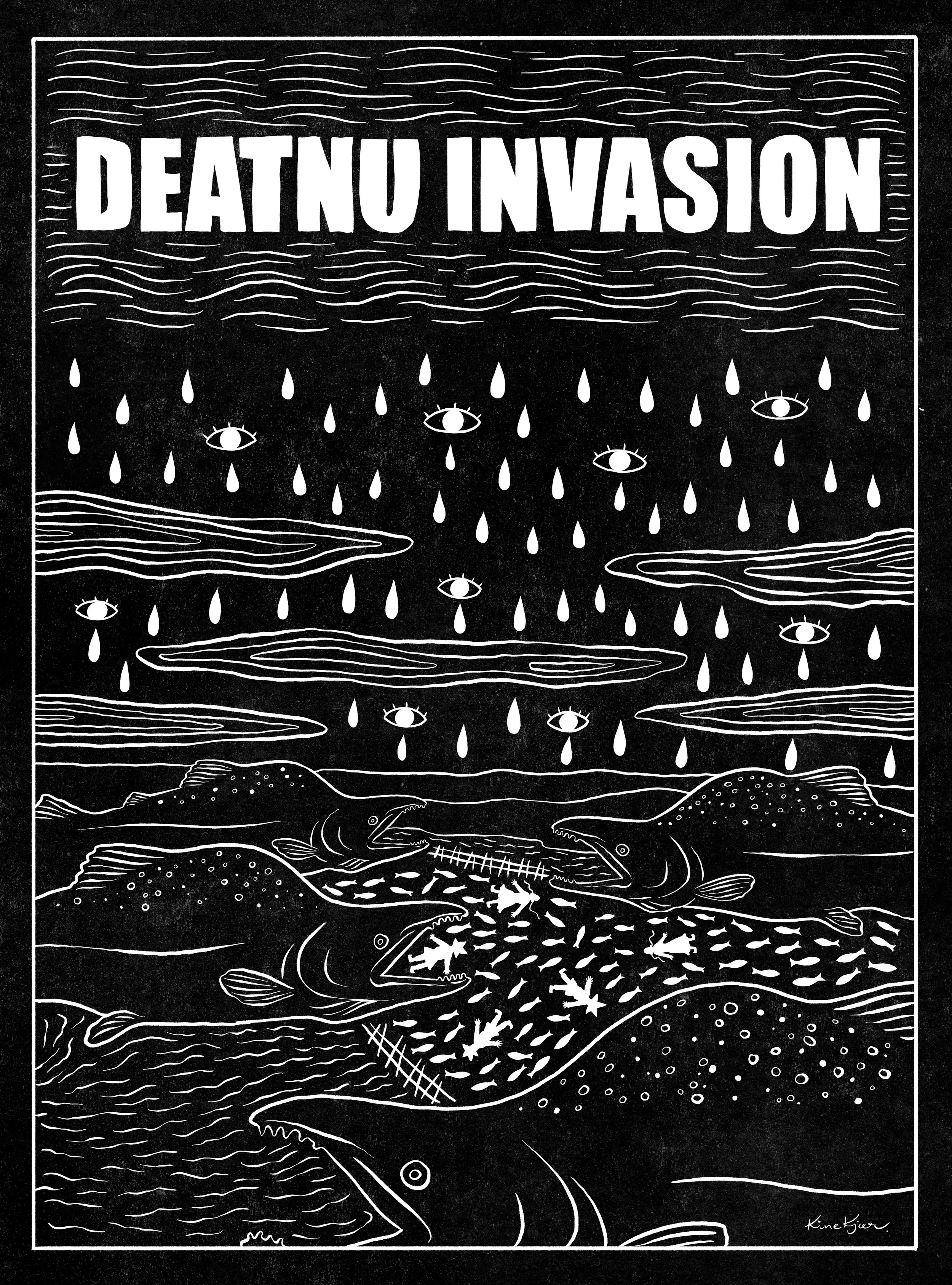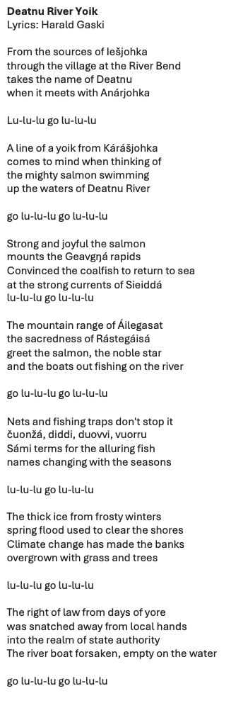 On the 4th of November, a new yoik was released as part of the Sharing our knowledge project. The idea for the yoik was coined at the River Dialogues across Sápmi tour, after a climate workshop using scientific methods to capture the opinions and voices of participants on climate risks and impacts on watersheds. The Sámi participants wanted another way of expressing climate change impacts using Indigenous traditions. Yoiking in Sámi culture is a way of appreciating and describing a person or phenomena, and the idea came up to create a yoik as a model of the relationship between the river Sámi culture and the Deatnu river. Professor II at the project, Harald Gaski, who was recently celebrated in an honorary seminar at the Sámi University of Applied Sciences on the occasion of his retirement Jubileumsseminar for professor Harald Gaski | Samisk Høgskole, fashioned the lyrics – or dajahusat in Sámi language. The lyrics capture the relationship between the Sámi and the river and expresses sorrow over the environmental changes – especially the lack of salmon and invasion of new salmon species to the watershed. The tune was crafted by the artist Niilas Holmberg from Ohcejohka Jalvvi Niillas Holmberg, who also participated in the International Indigenous Salmon Research Symposium organized by the project in 2024. The yoik is illustrated with an art piece produced by the Sámi artist Kine Kjær, who participated in the River Dialogues workshops and captured the spirit of the trip in the context of invading pink salmon and attempts of capture by a large salmon fence. You can listen to the result here: Stream Deatnu luohti by Camilla.brattland | Listen online for free on SoundCloud. Read the lyrics in Sámi and with the English translation by Harald Gaski below. Sámi juoigit – artists – are encouraged to create their own versions of the yoik and can contact the Norwegian Arctic University Museum for a copy.